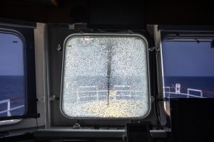 A destroyed window of the Ocean Viking ship after an attack by the Libyan coast guard | Source: SOS Mediterranée